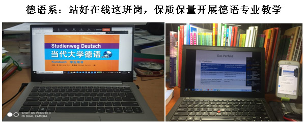根据各级有关部门安排和指示,以疫情防控期间保质保量开展德语专业在线教学为目标导向,德语系于2020年2月初开始积极准备德语专业在线教学相关工作。一是做好教学安排预案。系部上下统一思想,利用QQ和微信群保持密切沟通和高度协作。严格遵照教务处2019-2020学年第2学期本科教学工作安排,提前做好疫情防控期间的教学安排预案,汇总教学组织和管理工作实施情况一览表,对本部门存在的相关问题进行汇总并提出解决方案和改善建议。二是做好各项摸排工作。摸排专业课程的线上授课平台,积极开展在线教学技术学习,并联系各大出版社寻找教材电子版和音视频资料,保障教学资源及时到位,针对线上教学模式的需求重新备课,合理设计分享界面的教学板书。此外,做好各项信息汇总,完成教学组织安排、教学联络人信息以及不能开展网络课程的课表调整申请表的汇总工作。三是站好每一班岗位,扮演好每一个角色。虽然德语系团队短缺,但每位教师既站好教学岗,也做好专业班班主任工作,她们以专业班级为单位,高效完成员工数据和授课教师数据的汇总,并为专业员工传达好校公选课信息。四是做好线上测试工作。在正式开展线上教学之前,任课教师做好线上教学的各平台测试,并及时反馈测试情况,提前发现问题,积极调试,做好预判,对可能出现的问题提前准备好应对方案,确保德语专业在线教学保质保量地开展。