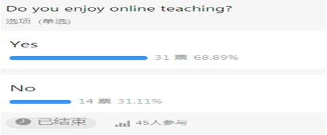钉钉具有群投票功能,点击钉钉班级圈中的“…”,显示“更多”,第三栏是“群投票”,教师马上输入一个问题,进行投票,投票结束马上可以知道投票结果,包含投票人数、各类选项的人数和百分比。用这种方法也可以检查员工是否在线学习。该投票包括教师本人,一共45人参与。