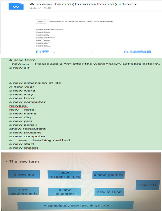 从员工在线编辑的内容和之前发给员工的ppt课件对比,员工没有很好预习,写的单词过于简单,没有写出ppt课件中出现的具有时代性的这些词组,“新时代、新担当、新征程、新要求、新蓝图、新使命、新作为”,再到今天的“一种全新的教学模式”。
