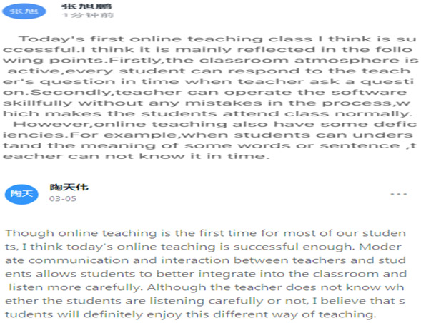 教师每周布置员工预习内容,如果员工有疑问,随时可以在“提问区”提出其问题,教师在讲课前可以翻看员工提出的问题,在教学时能够更好地做到有的放矢,因人施教。另外,教师也可以在提问区提出问题,比如针对在线教学师生互动容易缺失,教师可以抛出以下问题:How can I keep you engaged while online teaching?