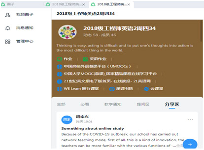 钉钉平台还有钉圈功能,打开我的圈子,有“分享区”,可以要求每名员工每周必须就本周的上课内容分享他/她的意见和建议,也可以告诉员工随时欢迎其分享学习经验、所见所闻、感慨等。教师可以在员工分享区参与评论。