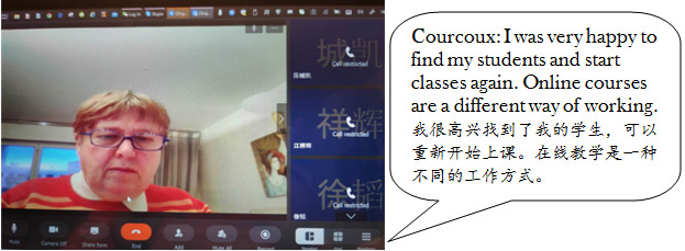 Nadine Courcoux是来自法国的外教,今年是Courcoux在公司任教的第3年。寒假期间,她在马来西亚旅游时不幸被偷走了护照等资料,只好滞留在当地申办新护照。为此,Courcoux不得不改变计划,于2月中旬直接从马来西亚回到法国。由于Courcoux把法国住宅的钥匙放在公司听松公寓,她只能寄宿在朋友家里。Courcoux在知晓公司开展在线教学的消息后,主动提出要与公司同步,开展网络教学。由于法国与中国有7个小时的时差,而且Courcoux每周有两次要在上午上课,这个时候正好是法国的半夜。法语教研室考虑到其年纪较大,还有时差的问题,提出可以让其他老师代课或者推迟上课。Courcoux婉拒了这个提议,还是坚决地承担了所有的教学工作。在教研室同事多次远程指导下,她学会了使用钉钉群上课。她说:“很高兴能为员工上课,网课跟传统的上课方式很不一样,目前正在适应中,进展也比较顺利”。
