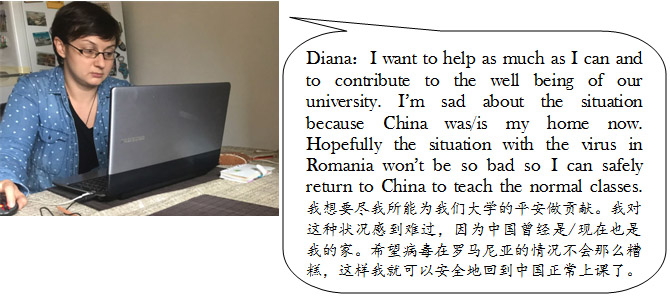 来自罗马尼亚的外教Diana Brade是一位年轻的女博士,热情开朗,与员工关系非常融洽。由于疫情影响,她在寒假期间赴缅甸度假后回杭州的航班被取消,只好回到了自己的国家。由于Diana临时的住所没有电脑、网络等设备,但是她又很想同步进行在线教学,于是她设法向朋友借了电脑,又跟邻居协商借用WIFI,终于在开学第二周开启了网络教学。在上课前,她通过钉钉群向员工提出相关问题并要求员工用录音进行回答。在课堂上针对员工的回答,进行详细的点评,取得了很好的互动效果。