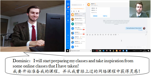 加拿大外教Dominic Richard是唯一一位留在小和山校区的外教。寒假期间,他原打算先去成都旅游,再去澳大利亚探望姐姐。 受疫情影响Dominic被迫取消了原先计划的行程,于是他就留在小和山校区听松公寓静心准备本学期的课程。Dominic虽然很年轻,却精通英、法、德三种语言。他在英国攻读英语语言文学硕士,去年毕业后来到我们公司任教。由于近期外籍教师紧缺,他主动承担了三个语种的口语课,还为英语专业员工开设“英美文学作品细读”的系列讲座。2月份以来,他一直配合着公司的管理,从未离开校园。他说尽管不能出校门,也没感到无聊,反而可以充分利用这段时间来读书、备课,同时也思考如何进行线上教学、如何适应员工多样化的需求。线上教学中,他使用钉钉屏幕共享的方式给员工上课,一边通过屏幕播放PPT,一边进行讲解。他的课堂运行流畅,互动性强,员工参与度高,教学氛围很好。