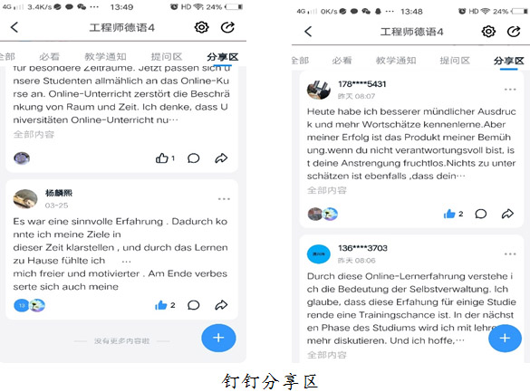 通过钉钉分享区,员工发表了对在线课程的评价。员工认为,通过该课程,听说读写语言能力得到了全方面的训练。比较突出的问题是:电子书和各种电子资料的使用不如纸质的方便。