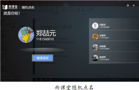 课中,会运用雨课堂的点到功能进行点名,员工可以发弹幕告知老师已到课堂。还会进行围绕预习知识进行的小练习,检查员工的预习情况。有时,课中还会进行听写,员工写好后在规定时间内投稿。