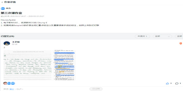 作业点评:钉圈中的作业功能使老师能够在电脑和手机上对作业进行点评,并将优秀作业进行展示,不仅在一定程度上激发和强化员工的学习动机,而且同学之间对好的作业互相点赞,有些员工每次交作业都要自带可爱或搞笑表情包,彰显个人风格,也极大地激活生生交互的良好氛围。