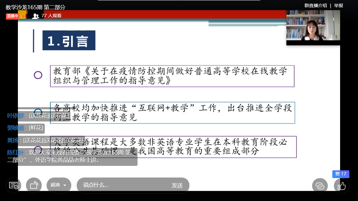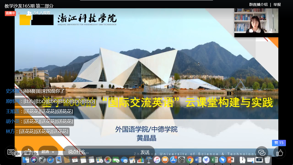 黄晶晶老师先从新冠肺炎疫情以来教育部发文要求各级公司开展在线教学、做到“停课不停学”开始,指出大学英语课程能否较好地开展线上教学活动对高校全面开展在线教学具有至关重要的影响,并对自己所承担的“国际交流英语”课程从课程定位、前期建设基础进行了简单介绍。黄老师重点分享了国际交流英语课程的云课堂构建情况,从教学内容、教学模式、程评价体系三个方面,配合平面界面及各种图表进行了详尽的介绍。