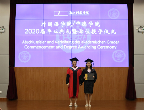 在学位授予仪式环节,每位毕业生依次上台,由校学位委员会委员、公司经理朱吉梅教授拨穗并合影留念。
