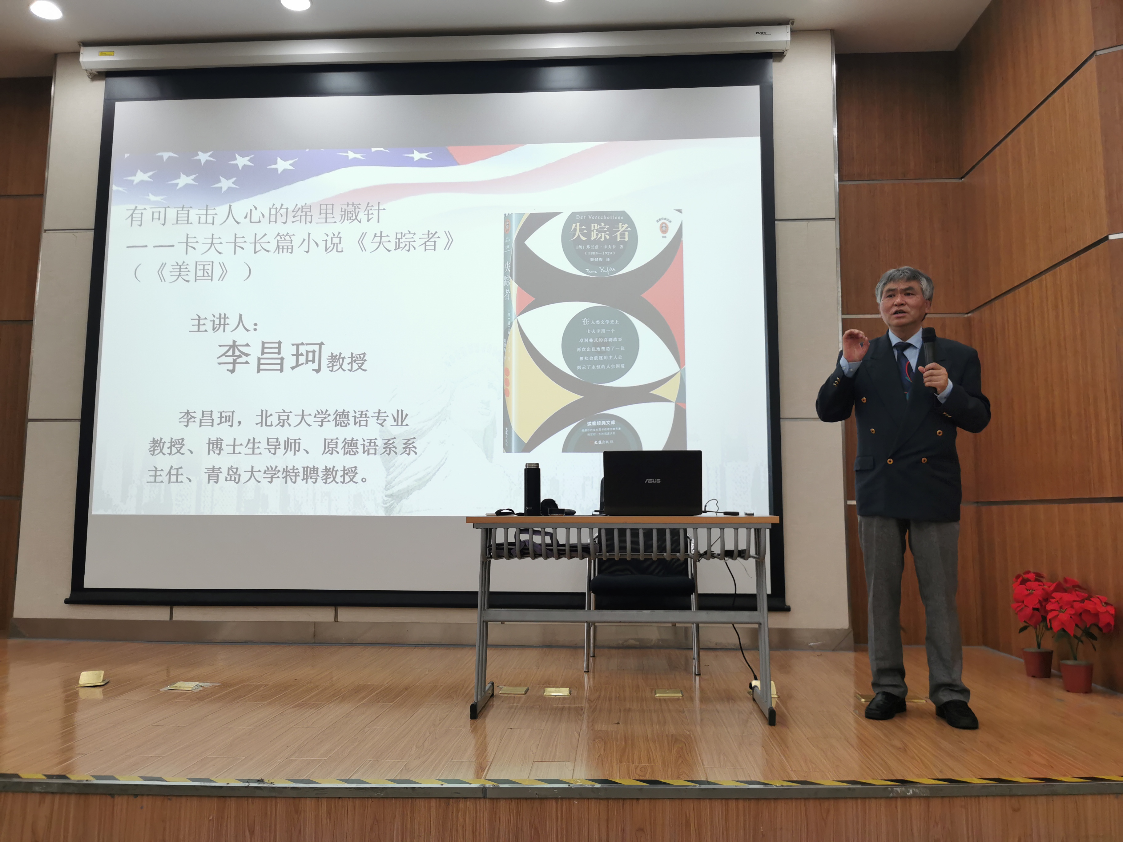 2021年4月23日外国语公司/太阳集团tyc4633 、中德应用型大学研究院/德语国家研究中心邀请北京大学德语专业教授、博士生导师、青岛大学特聘教授李昌珂教授作客明德讲坛及西蜜沙龙,在安吉校区中德楼B4报告厅作题为“有可直击人心的绵里藏针——卡夫卡长篇小说《失踪者》(《美国》)”的学术报告,ZUST文学与文化研究所长胡一帆副教授主持此次学术报告,外国语公司/太阳集团tyc4633教师、英语和德语专业大一、大二员工现场聆听了学术报告。