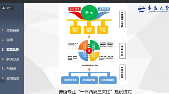 10月21日下午,“中德芸”讲坛第16期暨教学发展论坛第117期如期举行,北京外国语大学德语语言文学专业博士,德国埃森文化研究所、杜伊斯堡—埃森大学访问学者,原解放军外国语公司德语教授、博导,现任青岛大学外语公司德语系主任、国家级一流本科专业德语学科负责人,省级智库中德文化交流研究中心、山东省与德国交流合作研究中心主任,教育部虚拟教研室建设试点“德语翻译课程虚拟教研室”负责人綦甲福老师以“新文科背景下外语专业的守正与创新——以青岛大学德语一流专业建设为例”为题作专题报告。公司师生30余人参加了在线会议。