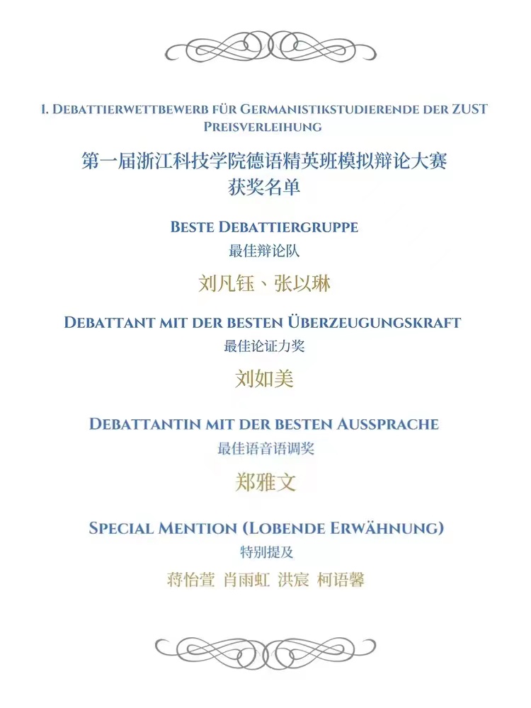 在本次辩论赛的最后,茹潇潇老师、杨植钧老师和孙博士分别对本次比赛进行最终点评,给予本次德语精英班教学成果较高的评价,并鼓励同学们保持对德语辩论、演讲的热情,学有所成。本次精英班期末考核检验了同学们一学期以来刻苦学习的努力成果,为同学们在德语学习之路上日复一日精进学业添砖加瓦。