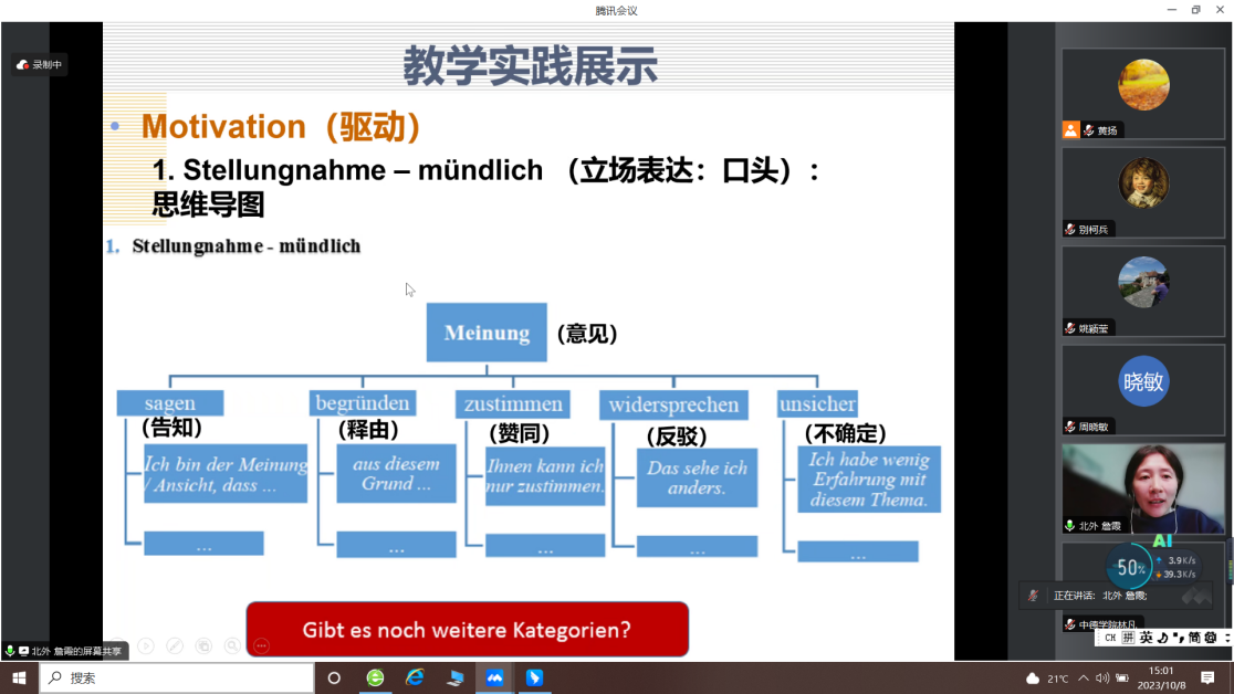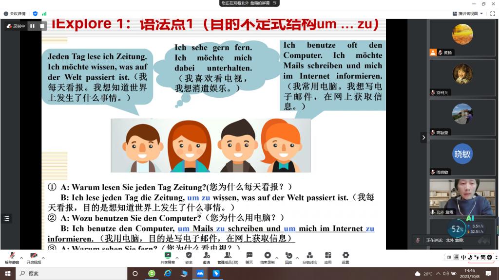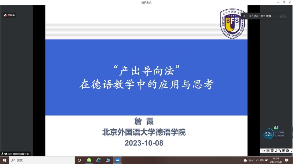 10月8日,“中德荟”讲坛第14期暨太阳集团tyc4633教学沙龙第10期如期举行,北京外国语大学德语公司副教授詹霞老师以“‘产出导向法’在德语教学中的应用与思考”为题作专题报告。太阳集团tyc4633及外院30余位师生聆听了在线报告。
