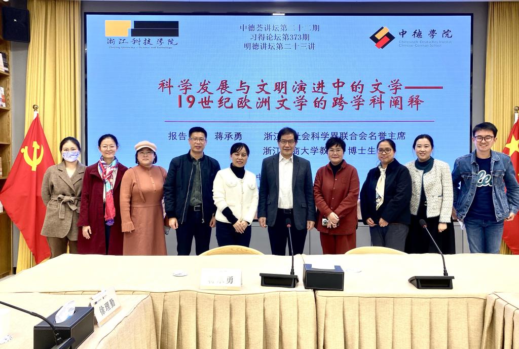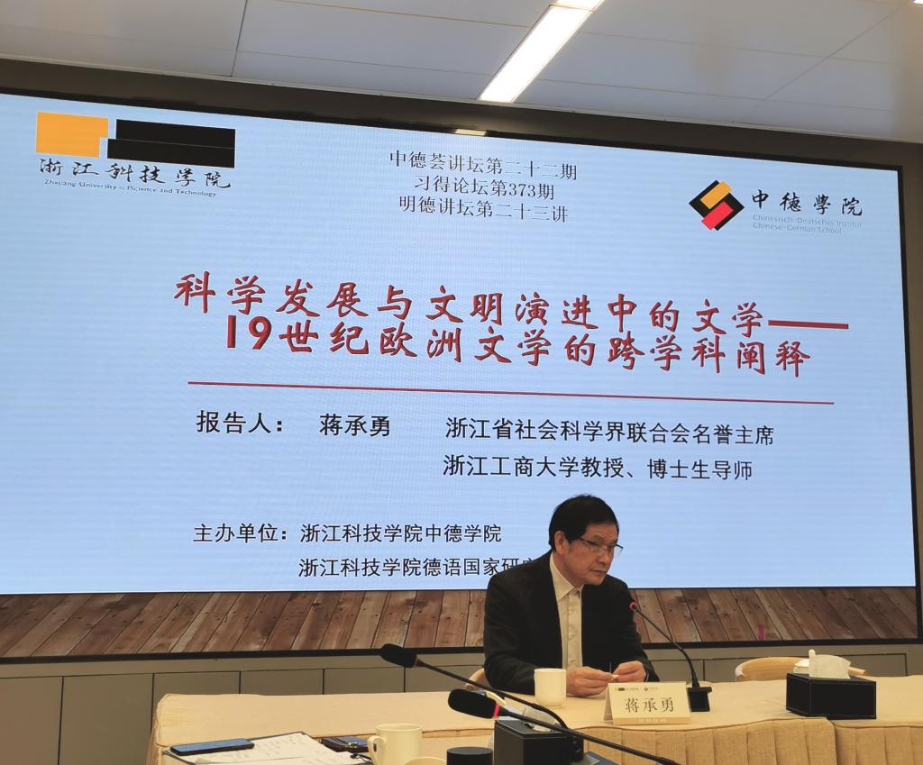 2023年11月24日,由太阳集团tyc4633和德语国家研究中心主办的 “中德荟”讲坛第二十二期学术报告在公司师生服务中心会议室举行。本次报告题为“科学发展与文明演进中的文学——19世纪欧洲文学的跨学科阐释”,由浙江工商大学文科资深教授、浙江省“特级专家”和“功勋教师”蒋承勇主讲,太阳集团tyc4633经理韩晓亚主持。德语国家研究中心主任徐理勤、科研处处长马伟锋以及太阳集团tyc4633、人文公司和德语国家研究中心的老师们现场聆听了本场学术报告,反响热烈。