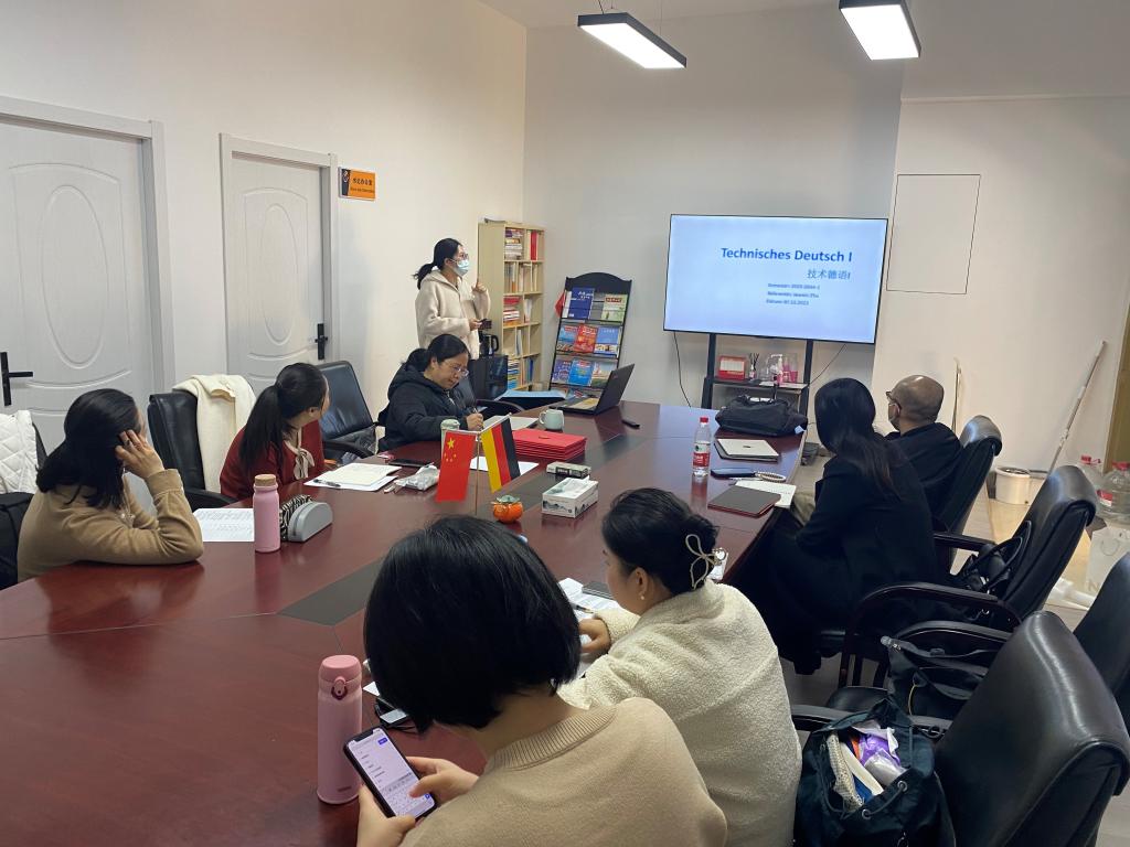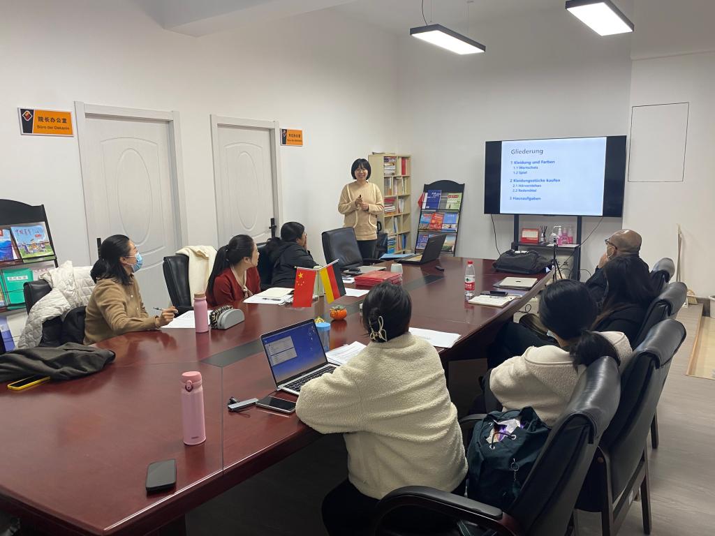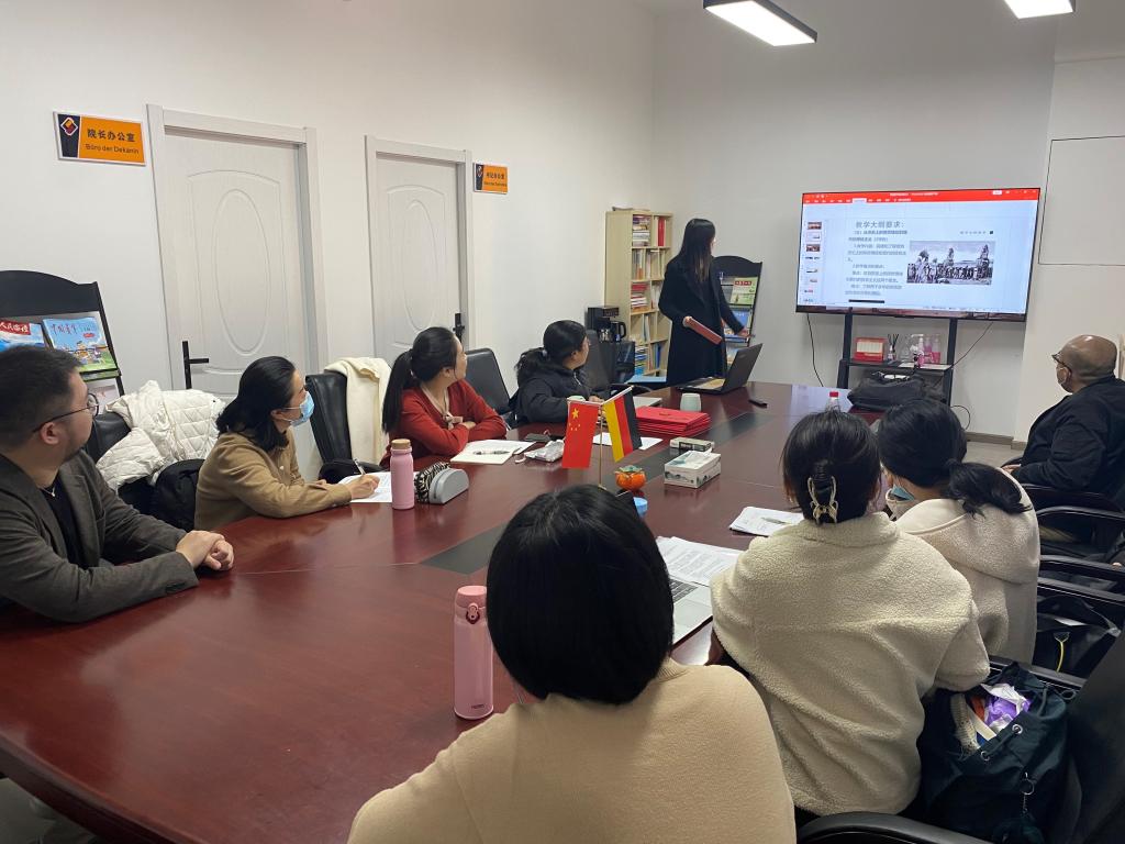 参加院级比赛的教师先后展示了自己的参赛作品。孔文静老师的《初级德语1》展示了新技术的应用,例如德语学习APP,自动生成词汇练习的Quizlet等。杨植钧老师介绍了通过Edupad平台和员工同步进行的文本编辑的方法。孙昊晨老师运用线上资源进行线上线下混合式教学,使用词汇云进行课后练习。陈巧老师的《综合德语1》课程设计巧妙,运用产出导向法理论全面育人。其余老师的比赛作品也各具特色,为创新德语教学提供了不少好点子。