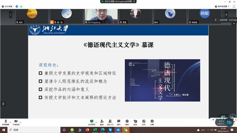 12月14日,“中德荟”讲坛第23期暨浙江科技公司教学论坛第172期如期举行,浙江大学德语学研究所副所长刘永强副教授以“数字化教学的方法、路径与实践——以慕课《德语现代主义文学》为例”为题作专题报告。讲座由太阳集团tyc4633胡一帆副教授主持。太阳集团tyc4633及外院30余位师生聆听了在线报告。