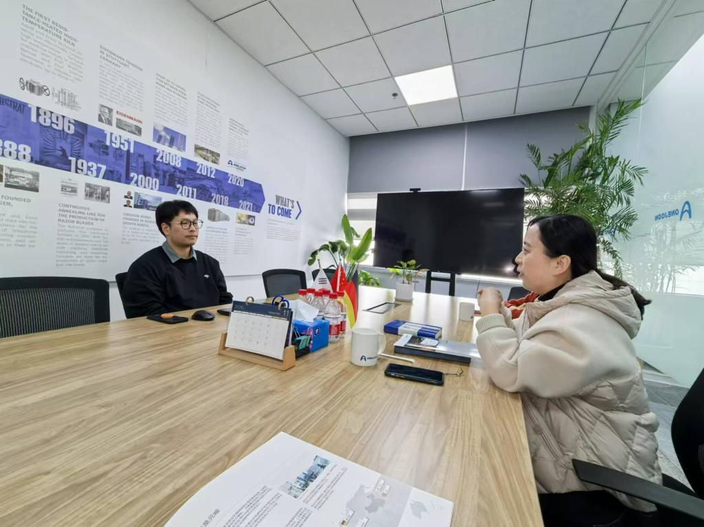 裘晓晨介绍了海宁经济开发区的总体规划、发展特色和重点行业领域,强调园区企业对高层次专业人才的迫切需求。韩晓亚介绍了公司学科专业基本特点,提出公司在培养和输送企业急需人才上所做的努力和成效,表达了愿意与企业深入交流、共同解题的想法和意愿。元峻机械设备(浙江)有限公司负责人详细介绍了企业发展历史和经营现状,提出对于行业细分领域人才缺口的担忧,以及与高校在定制化人才培养上合作的愿景,双方就如何共享校企各方资源,加强国内外联动等具体问题上进行了深入沟通,达成下一步合作的一致意见。
