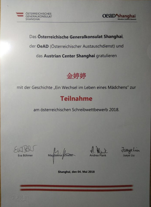 5月4日,由奥地利驻上海领事馆、上海奥地利中心、OeAD Lektoratsprogramm联合举办的第五届德语征文比赛颁奖典礼在复旦大学举行。公司德语161班金婷婷同学荣获优秀奖。此次活动是主办单位面向所有学习德语的中国员工的征文性比赛。