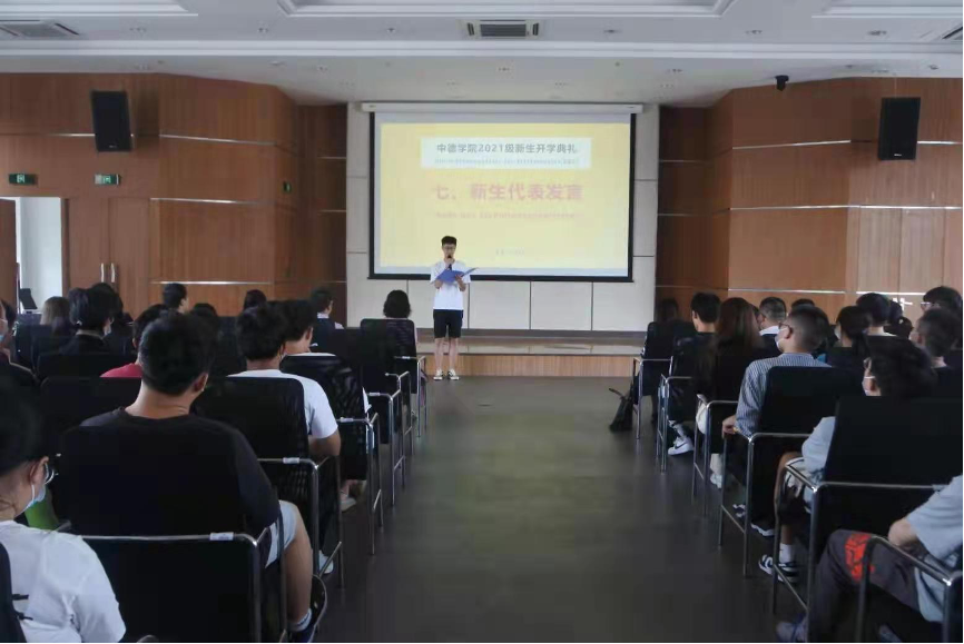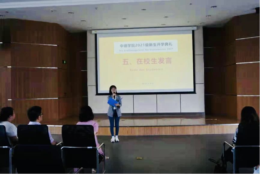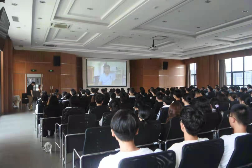 主持人还连线了2位留德员工,请他们分享自己在德国的留学经历,点燃了在场新生们出国学习的热情。新生代表王子豪的发言,传递出了同学们对老员工活的期待,洋溢着青春活力的气息。
