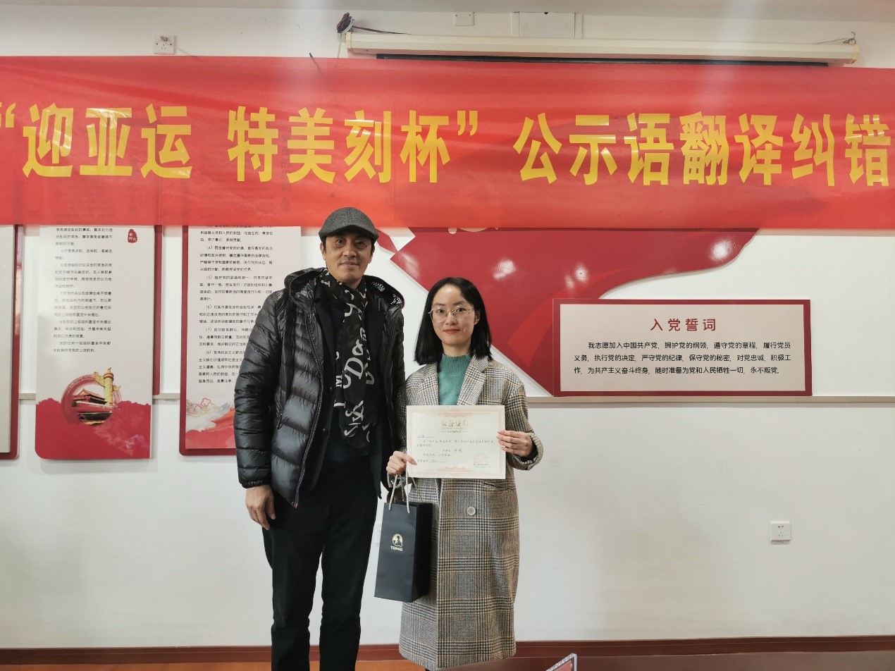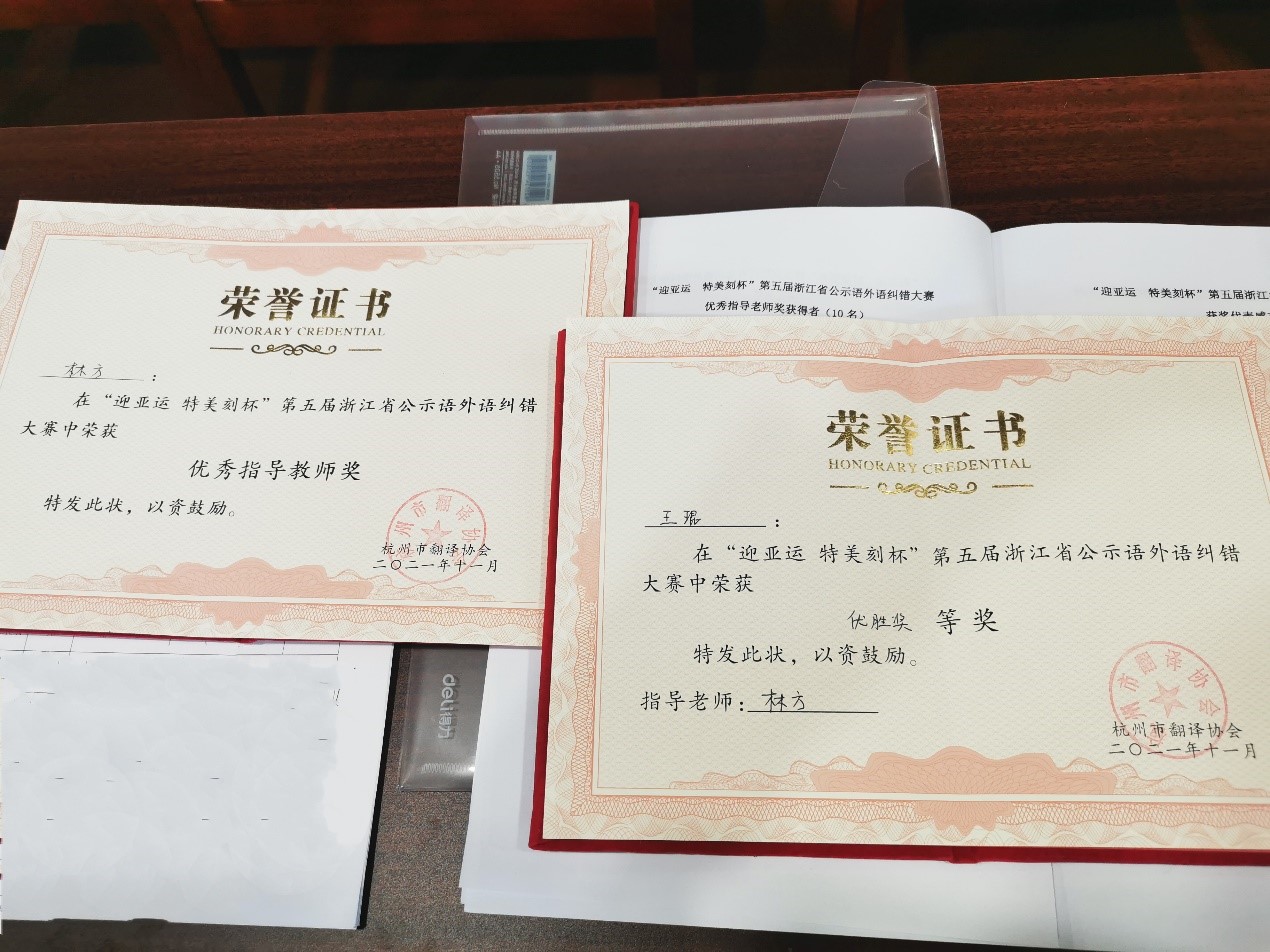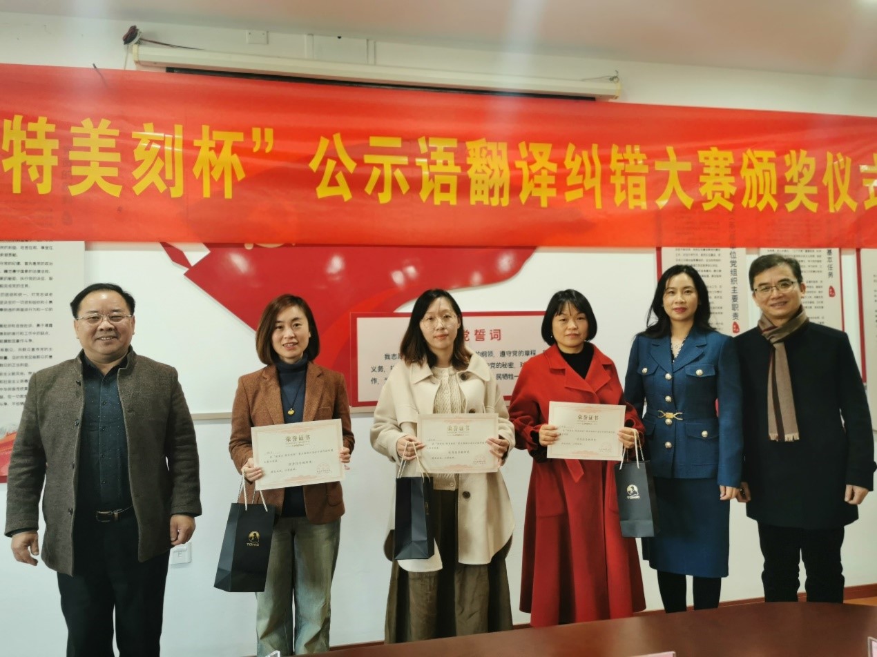 2021年12月4日,“迎亚运 特美刻杯”第五届浙江省公示语外语纠错大赛颁奖典礼暨杭州市翻译协会四届二次理事会于杭州科技职业技术公司隆重举行。公司德语专业系主任林方老师与德语201班王琨同学应邀出席。此次大赛中,公司林方老师获“优秀指导教师奖”,王琨同学获“优胜奖”。