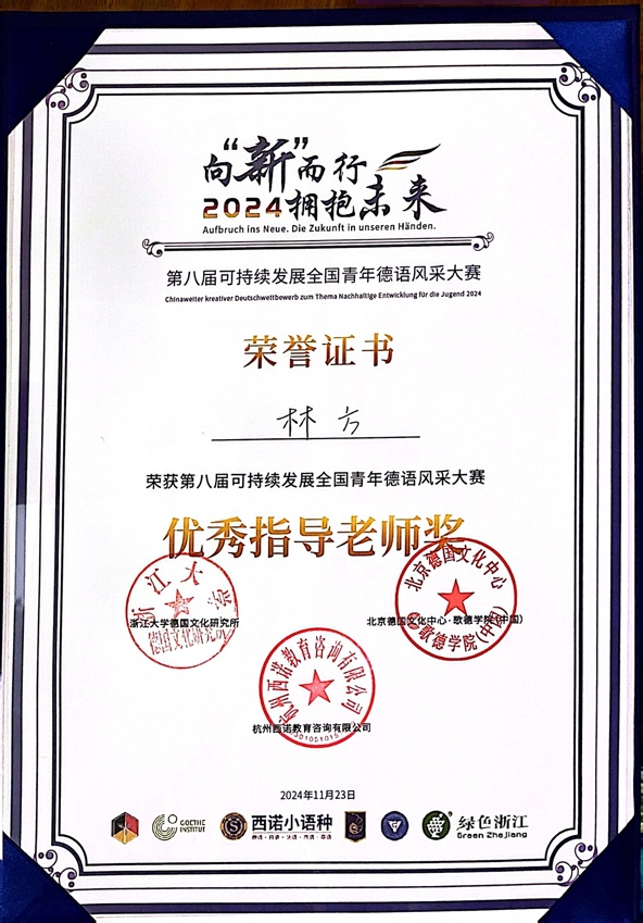 陈最:十分幸运能作为这支小队的一员参加此次德语风采大赛,能够在大赛中获得三等奖,我感到无比的荣幸和感激。除此之外,我也十分享受紧锣密鼓且充满团队合作的备赛过程,从选题到内容,再到展示形式,每一步都倾注了我们团队的努力与智慧。特别是在林方老师的指导下,我们不断优化细节,从容应对挑战。正如杭钢的数字化转型一般,我们迎难而上、砥砺前行,完成了自我的“蝶变”,取得了丰硕的成果。