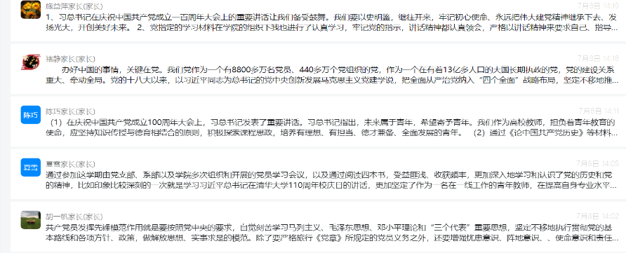 通过集体分享,党员教师们对自己的学习情况有了更多的思考,对党史学习教育的总体要求有了更深刻的认识,有利于党史学习教育的持续性、深入新和有效性开展。
